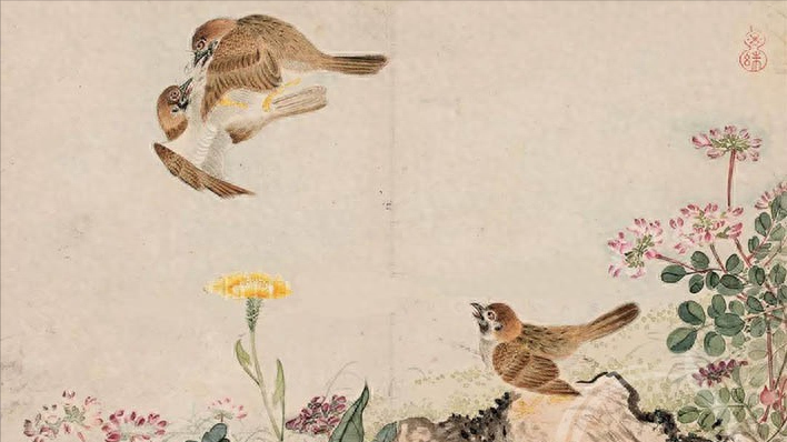 The decoration showcases a pair of hand-painted magpies frolicking among vibrant rhododendrons, elegantly outlined in genuine gold enamel, symbolizing joy and good fortune.